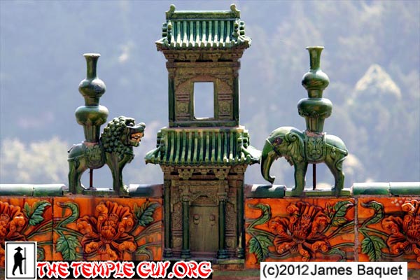 (16) Another roof crest, this one at eye level from a hall above it. The elephant represents Puxian, the Bodhisattva of Great Practice, and the lion represents Wenshu, the Bodhisattva of Great Wisdom (whom we saw all over Wutai Shan). They are placed on the side of the roof corresponding to where they would be in the hall (if they were there).